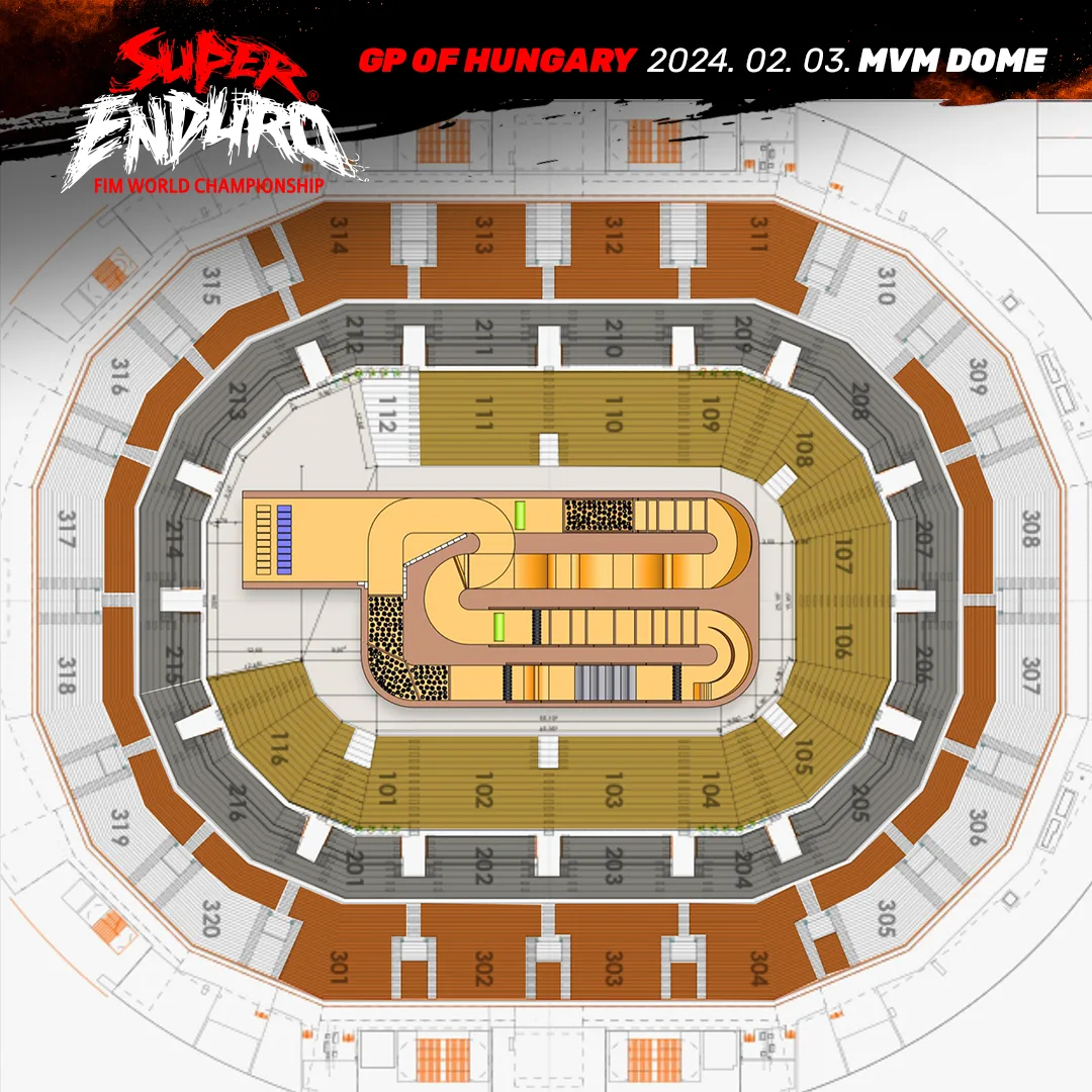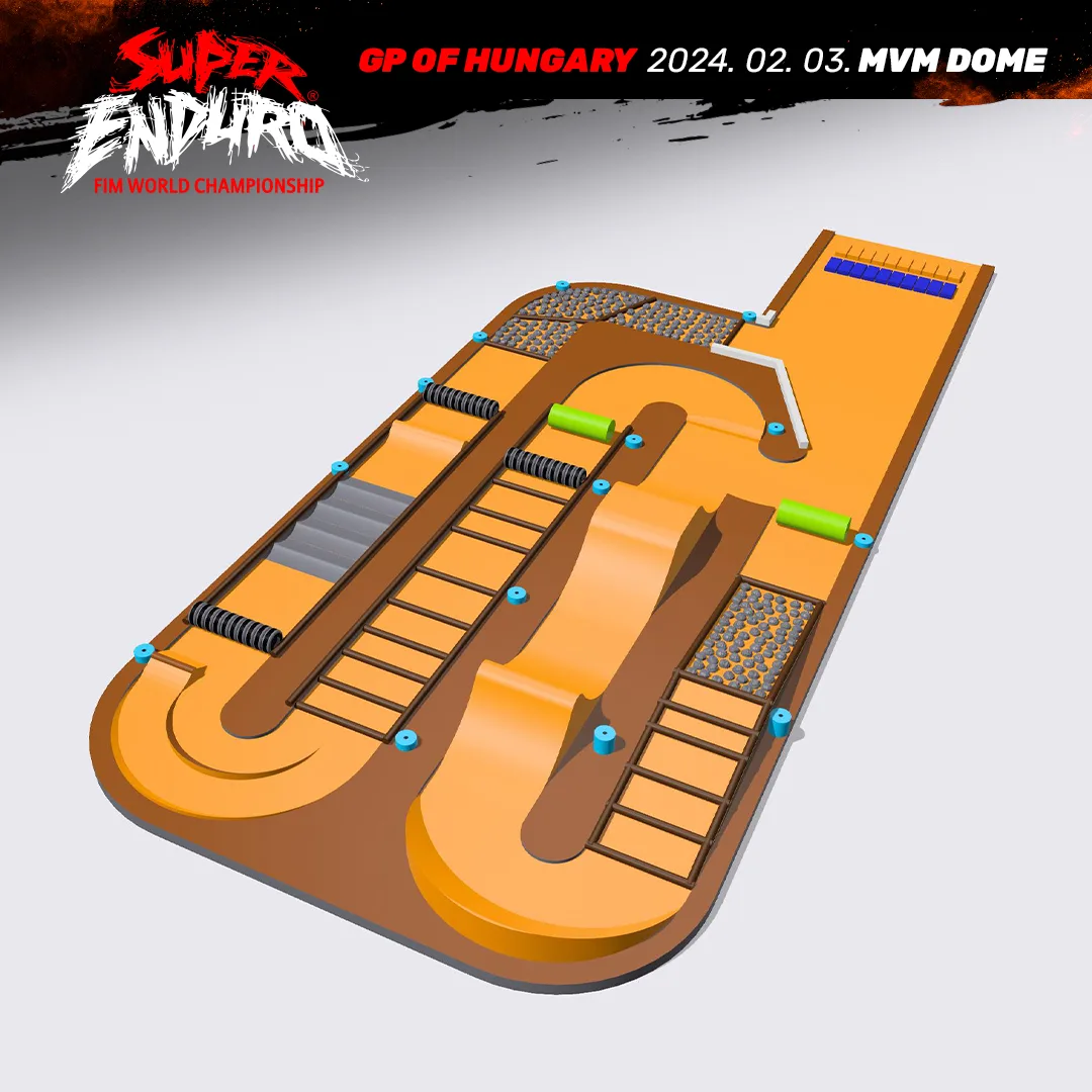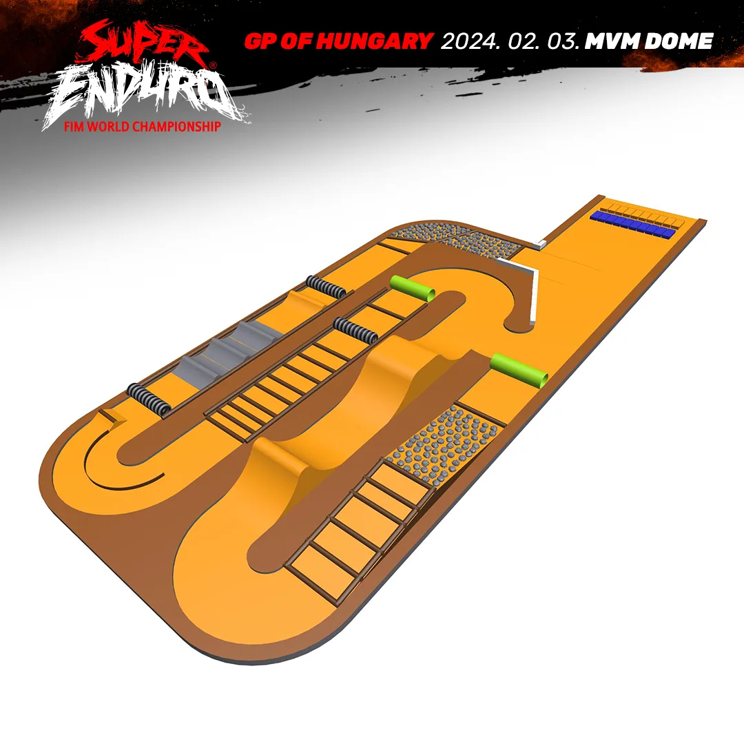 A Superenduro GP of Hungary pályája építéséhez 84 kamionnal szállítanak be a sportcsarnokba 1600 tonna földet, 40-40 tonna követ és faanyagot, illetve 3,2 tonna üvegszálas csőelemet és a V-Híd Építő közreműködésével épül. A pályán a természetes akadályok mellett épített ugratók és a sziklák, valamint rönkök kombinációjából álló mátrixok is nehezítik a versenyzők életét.