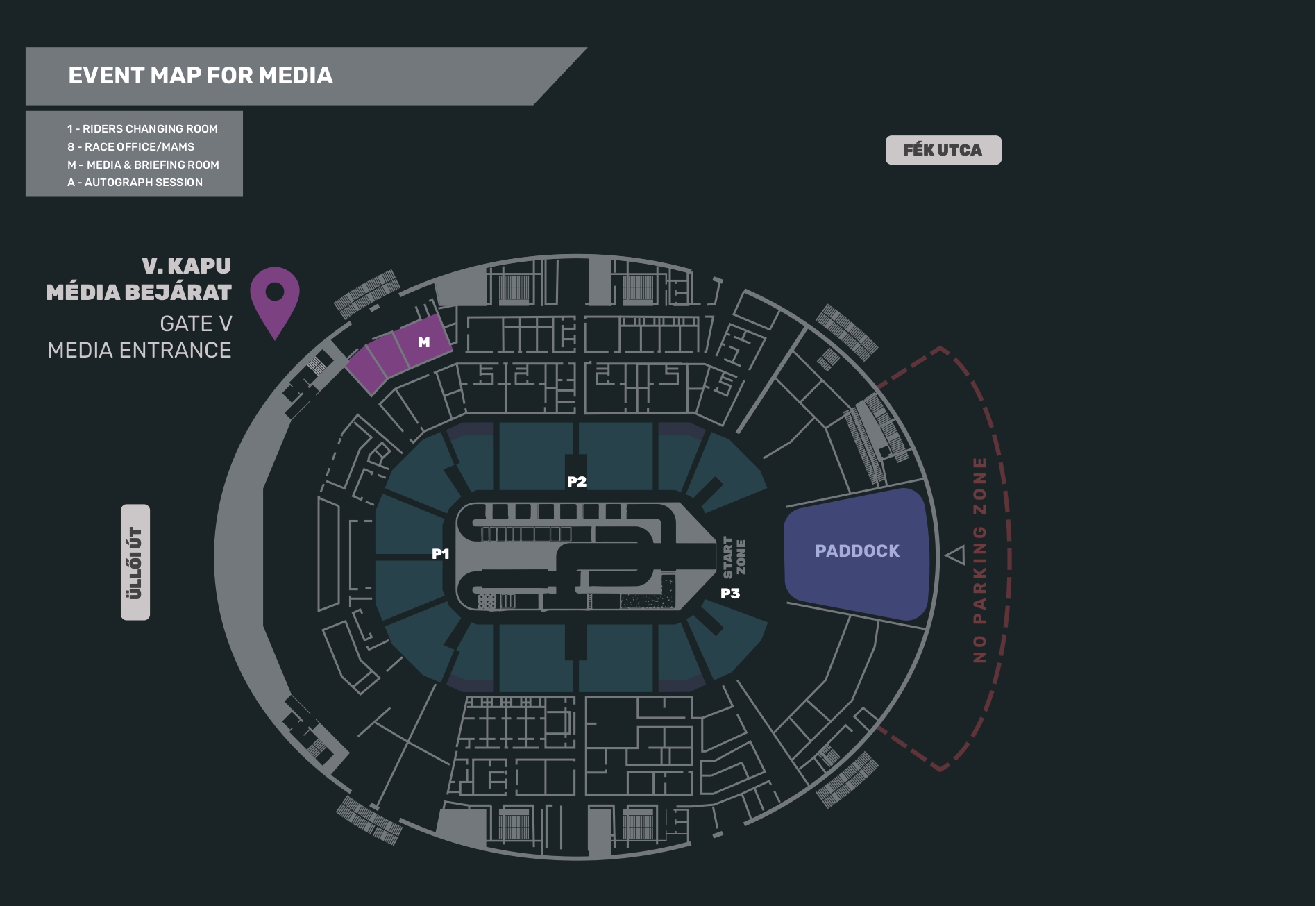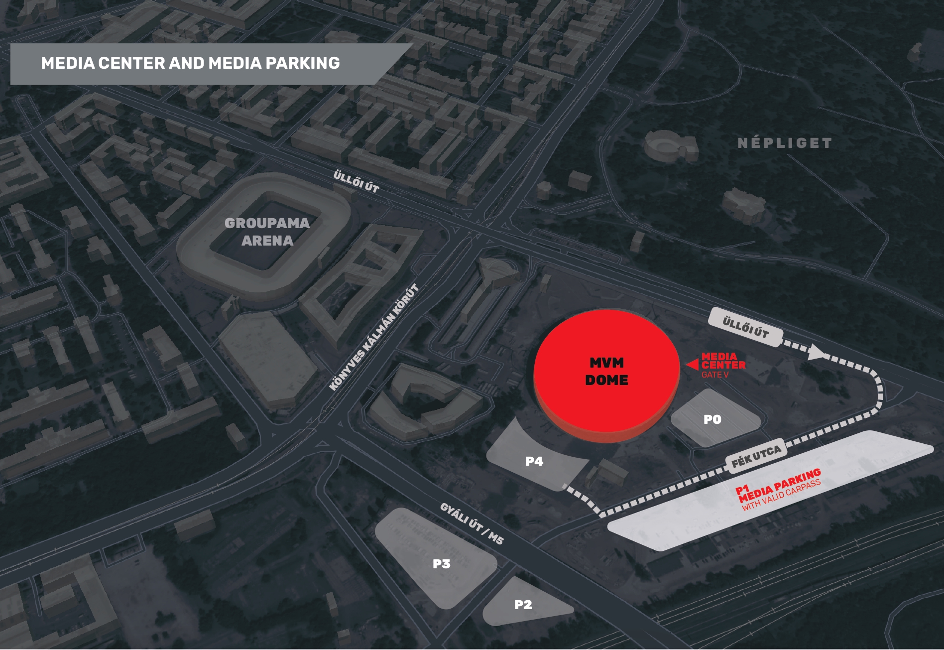 The media parking is accessible by turning right from Népligeti overpass onto Fék utca from Üllői út. Then, turn left at the first opportunity to reach it. It is exclusively available for accredited media representatives.